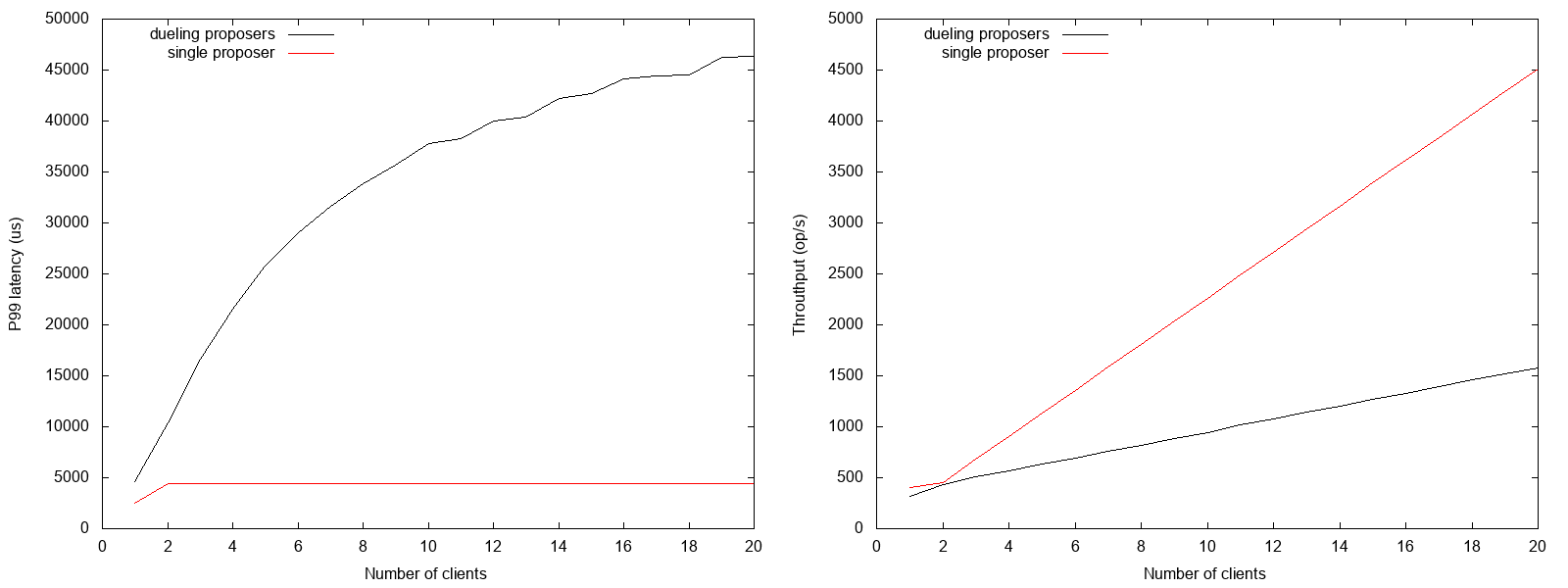We see that when there are 20 clients then the dueling reduces throughput 2.85 times from 4513 ops/s to 1581 op/s and increases p99 latency 10.37 times from 4467 microseconds to 46 milliseconds.