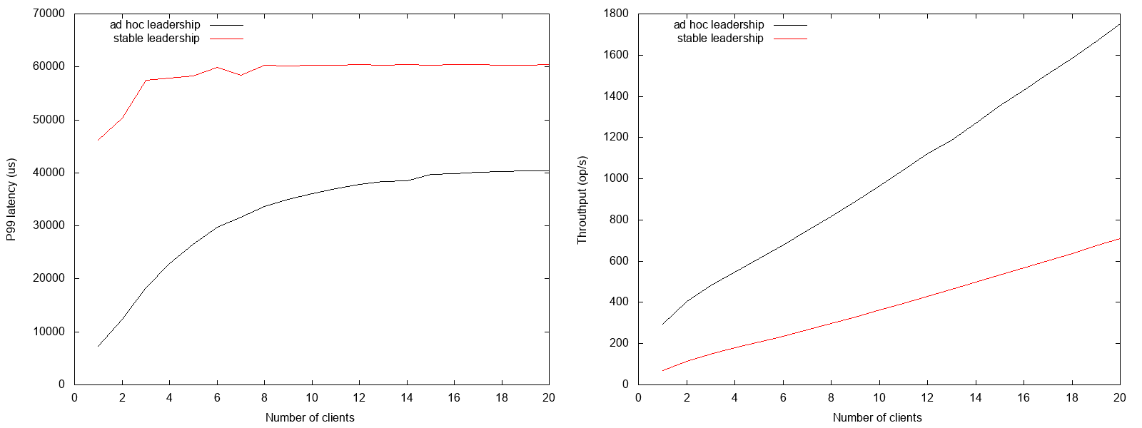 For 20 clients the fault injections cause the stable leadership to have 2.46 times lower throughput (709 ops/s vs. 1750 ops/s) and 1.5 times higher p99 latency (60ms vs. 40ms) than an ad hoc leadership approach.