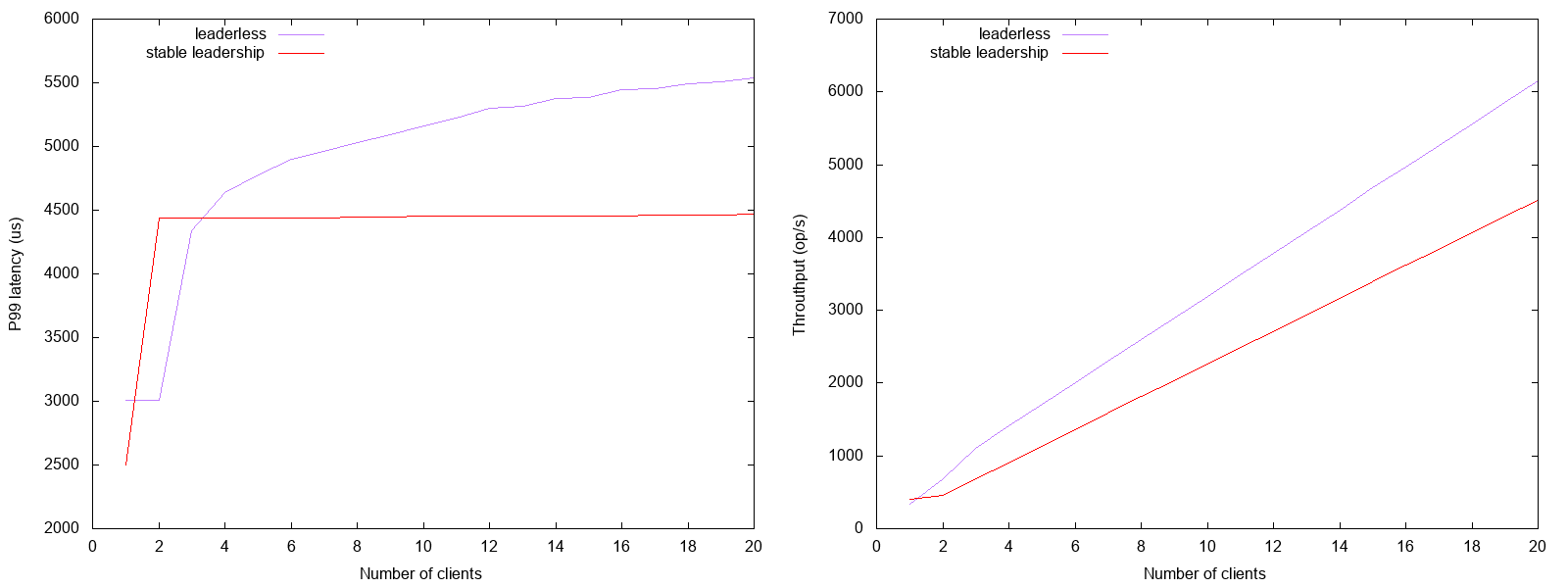 I built a leadered version of consensus replication and used fault injection to demonstrate the issues. The stable leadership is compared with ad hoc leadership which is known to suffer from dueling proposers under normal circumstances. The leaderd system uses 4ms election timeout while the fault injector isolates a random replica for 12ms.