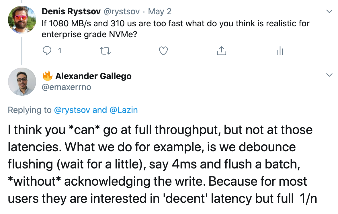 The trick is that a major part of the latency comes from the disk IO. When we aim for high throughput we should make small delays to accumulate writes (4 ms) and write them in batches even when we use NVM.